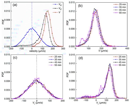 The distributions of f(Vx, Vz) in the x-z plane at 20–55 min are shown in Figure 6, in which the areas with high probability density are similar to the shape of mushrooms. The value of Vx is mainly within [−80, 80] µm/s with the symmetric axis around Vx = 0 µm/s, while Vz is basically above 80 µm/s. It is obvious that the spatial distribution is less clustered at t = 55 min with the accumulated area surrounded by red, dashed line extending in the z-direction and narrowing in the x-direction, as shown in Figure 6a,h.