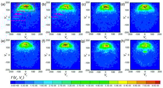 Distribution of f(Vx, Vz) at different time: (a) 20 min, (b) 25 min, (c) 30 min, (d) 35 min, (e) 40 min, (f) 45 min, (g) 50 min, and (h) 55 min.