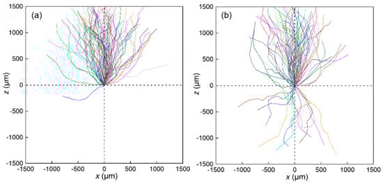 Swimming trajectories (100 tracks) of H. akashiwo cells in x-z plane: (a) t = 20 min, and (b) t = 55 min.