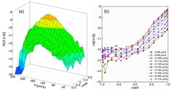 Distribution of ln[f(V,θ)]: (a) ln[f(V,θ)] versus V and cosθ, (b) ln[f(V,θ)] versus cosθ for given V.