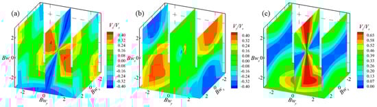 The swimming velocity V and translational diffusivity tensor D of H. akashiwo were found to change with the horizontal vorticity. For the case of wx = 0 and wz = 0, the longitudinal swimming velocity Vx increased firstly to a maximum and decreased to zero with the increase of wy, the vertical swimming velocity Vz decreased with the increasing wy, and the lateral velocity Vy kept constant, as shown in Figure 17a. When |Bwy| > 0.9, Vx is greater than Vz. For the weak horizontal vorticity, algal cells can swim with an angle against the vertical direction. However, for the strong vorticity, the cells cannot swim upwards in a fixed angle, as shown in Figure 17a, because the maximum gravitational torque due to the difference of cells’ buoyance center and mass center cannot balance the viscous torque caused by the flow shear []. Figure 17b presents the variation of translational diffusivity with lateral vorticity. It is shown that the diagonal components of translational diffusivity are much greater than the off-diagonal components. For the weak horizontal vorticity, the translational diffusion are found to be anisotropic. With the increase of horizontal vorticity, the anisotropic translational diffusion tends rapidly to the isotropic translational diffusion with the diagonal components equal to 1/3.