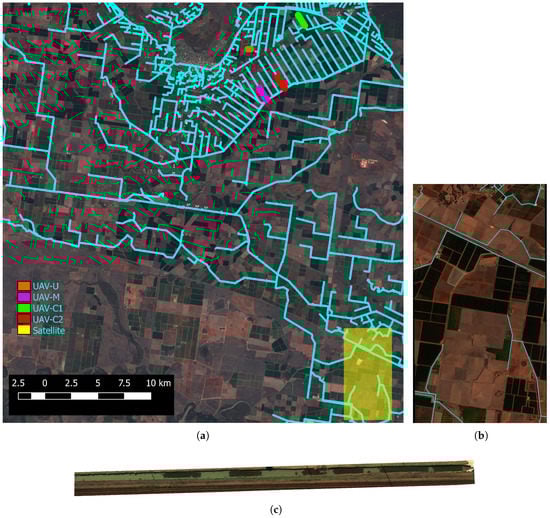 (a) a portion of the Murrumbidgee Irrigation Area with imagery from the Sentinel-2 constellation from 1 Jan 2018. The supply channels are shown in blue. The areas mapped by the UAV and satellite are shown; (b) one of the WorldView-3 satellite images; (c) UAV image of the untreated (U) channel.