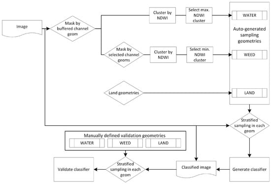 Method of generating a classified image from a satellite image. The land and selected channel geometries are constant across images, so a new classifier is generated for each image without a user needing to manually define new water, land and weed polygons.