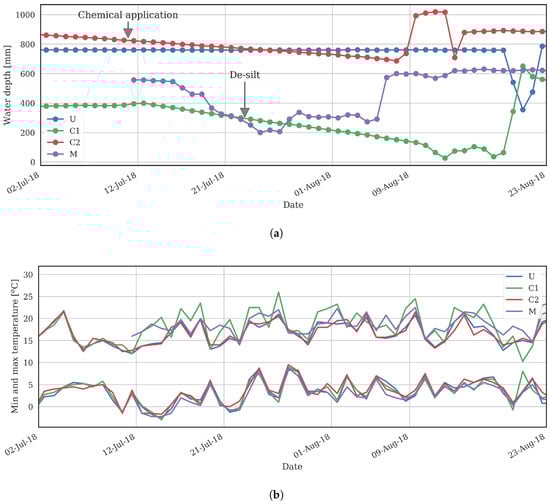 Logger data from each of the sites. (a) water depth with dates on which UAV images were taken indicated with vertical lines; (b) the minimum and maximum daily air temperatures.
