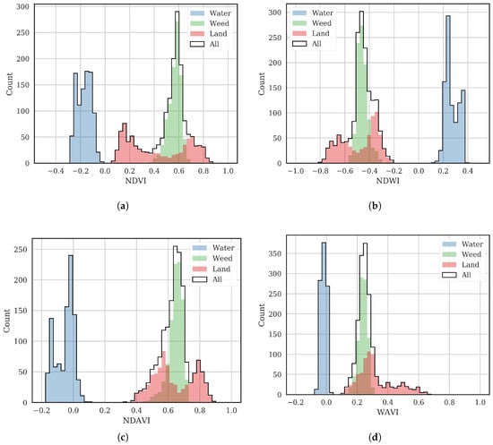 Vegetation index histograms for each of the classes for the 2 July image of the C1 channel. (a) NDVI. (b) NDWI. (c) NDAVI. (d) WAVI.