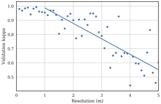 In this section, the effect of image resolution is investigated for the 2 July image of the C1 channel. This is useful to find the minimum required image resolution to classify weed areas in irrigation channels. The UAV imagery had a native resolution of 0.05 m. The imagery was coarsened from 0.1 to 5 m using the GEE resample algorithm. The results are shown in Figure 6. It can be seen that classification accuracy is very good with resolutions less than 1 m. It drops off rapidly above this. This is intuitively expected, as the channel widths are less than 10 m, and weed areas are often small and isolated. The points in Figure 6 increasingly deviated from the line of best fit as pixel size increased. One reason for this is the training and validation sets became small, as there were limited pixels to sample within the validation geometries with large pixel sizes.