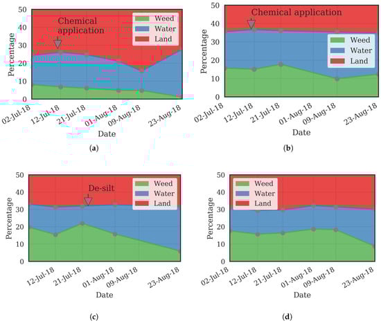 The four channels (Table 2) were imaged throughout the study period. The fixed training geometries for land and channel were defined for each of the channels. After classification, the area of each of the classes (water, land and weed) was computed. This could be used to indicate decline or growth of weeds. All this takes less than a minute in the GEE cloud computing environment. The results are shown in Figure 7. Note that these results are during the winter period, where there are a lot of dynamics in channels being drained and refilled, and weed control works being done. The characteristics are likely to not show as much variance during the peak irrigation season.