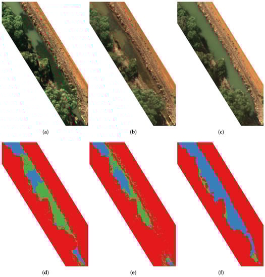 The (a) first, (b) fifth, and (c) sixth images from the time series UAV images of the C1 channel (small portion shown). The corresponding classified results for the (d) first, (e) fifth, and (f) sixth images are shown in the bottom row, with blue = water, red = land and green = weed.