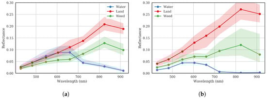 Reflectances of samples from each of the defined class polygons in the WorldView-3 images. The lines shows the median reflectances and the shaded areas the 25–75th percentiles. (a) 2017 image; (b) 2018 image.