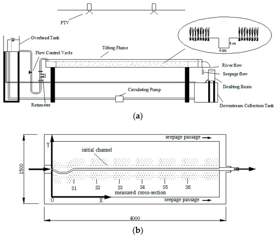 The actual flow was divided into two parts while passing through the basin: one of which flowed along the bed and bank boundary of the river channel forming a channel flow, and the other one seeped into sand, forming a seepage. In this research, to better imitate a natural situation, to separate the seepage from the total flow, a 0.25 m-wide seepage passage was set up around the flume with the filter screen arranged between the riverbed and passage to ensure water passed through and was intercepted by sand. Therefore, in theory, the total discharge is equal to the sum of the channel discharge and the seepage discharge: