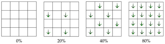 Agrostis stolonifera has similar biological growth characteristics to Avena sativa L and Alfalfa, which was used by other scholars [23,28,29,43,44] to represent riparian vegetation, making it convenient for reaching the limit where the biological and the hydrological timescales are comparable over the limited duration of the experiment [27]. A study by researchers at the U.S. Department of Agriculture [45] showed that the cohesion provided by Alfalfa roots to non-cohesive sand is comparable to the magnitude of root-reinforcement provided to natural streambanks relative to the strength of the bank material alone. Therefore, Agrostis stolonifera is also a realistic way of simulating vegetation in the laboratory. The effective root coverage is taken as the vegetation coverage. Vegetation coverage averages from 0–100% to analyze the nonlinear effect of linear density change on river channel evolution. The sketch map of vegetation arrangement is shown in Figure 3. The mean diameter of effective root cover d ≈ 1 cm. The calculated four effective coverage rates were 0, 20, 40 and 80% (K1 = 0%; K2 = 4(πd2/4)/A ≈ 20%; K3 = 2 × K2 ≈ 40%; K4 = 4 × K2 ≈ 80%).