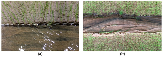 As for vegetation, Agrostis stolonifera was chosen due to its fast germination and development. Agrostis stolonifera can adapt to the sandy bed, and the growth state can be maintained as long as a month, sufficient to meet the requirements of the test cycle, as long as the sand is kept in a certain amount of moisture. Though experimental observation, germination was achieved after 2–3 days with short roots of about 1 cm at about 23 °C in summer. In the early stage of growth, plants of A do not develop a substantial stem, and after 8 days of growth, it will remain in the grass state and will not continue to grow rapidly. However, it grows slowly in winter; seed germination takes about 10 days, reaches the grass state after 20 days and needs heating to accelerate its germination and development during the whole growth process. Therefore, it is generally tested in summer. The scour depth is closely related to the root sizes [40,41], and the vegetation collapse and uprooted time affect the relative timescale of scour-inducing floods and can set the subsequent course of channel and riparian ecosystem evolution [42]. Therefore, grass with the state of no longer growing fast was used as riparian vegetation for analysis to exclude the influence of timescale and other conditions on the experimental results.