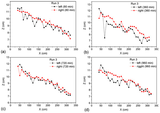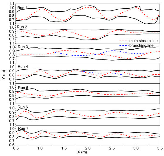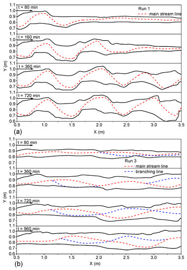As seen in Figure 9, Runs 2, 3 and 4 included three groups of one-sided vegetation cover (left bank vegetation cover), showing the main stream, tributaries and final riparian erosion. At 960 min, a large deflection of the main stream formed, and the erosion rate of the two bank sides was different. Specifically, the center of the channel at the initial time was located at y = 0.85 m. Finally, the evolutions of the main stream lines were all inclined to the right bank. The curvature of the right bank line showed non-uniform distribution, and the curvature was larger; the left bank presented overall erosion recession, and the curvature was smaller. The difference in the erosion rate of the two bank sides will be analyzed in detail in Section 3.3.