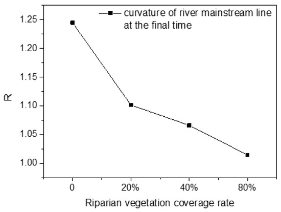 The relationship between the final curvature of river channel main stream and the vegetation coverage rate of bilateral riverbank cover is shown in Figure 10. As can be seen from the diagram, vegetation coverage effectively reduced the curvature of the river channel. With the increase in the coverage rate, the curvature of the river decreased gradually and tended to one (Figure 11a,b). When the vegetation coverage reached 80%, the curvature was 1.01, indicating that the river was close to a straight river type.