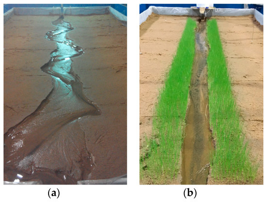 Laboratory experiments have investigated the impact of vegetation on river channel morphodynamics in two aspects: flow structures under different discharge and vegetation (stem density, flexibility, canopy architecture, etc.) [20,21] and vegetation on river channel morphodynamics [22] and planform [23,24]. Experiments showed that riverbanks of emergent vegetation in overwidened, straight channels can induce channel narrowing and increased sinuosity [25,26], and vegetation transforms the river planform by reinforcing sediment and so reducing channel widening and channel cutoffs [23]. Recently, the impacts of vegetation growth stage and rate have been explored [27,28,29], showing that as vegetation establishes under the same flow and sediment supply conditions, sediment retention increases; fewer, less mobile, narrower and deeper channels are maintained; and plants with small rooting depth are preferentially eroded, leaving deeper rooted plants, stabilizing sediment.