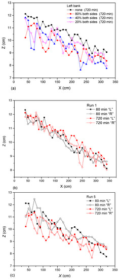 Longitudinal variation of near-bank bed elevation (a) for different riparian vegetation cover, (b) no riparian vegetation coverage in Run 1 and (c) 80% riparian vegetation coverage in Run 5, where L represents left bank and R represents right bank in the figure legend.