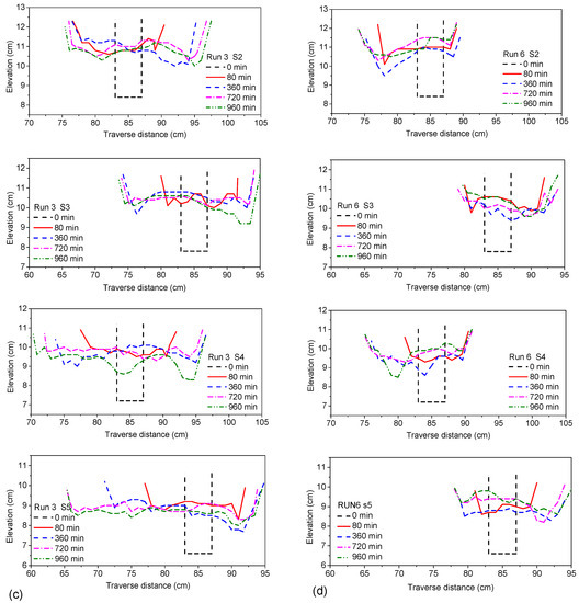 The cross-section of the river bed mainly reflected the process of erosion and deposition of the riverbed and also reflected its widening process. Four runs (1, 3, 5 and 6) under different conditions were selected for comparative analysis (Figure 16a–d, respectively). The focused time frame was from 0 min to the final stable time. We chose the section of the second to fifth as the typical sections to study ignoring the impact of entry and exit, and the corresponding transverse section of x = 1.0 m (S2), x = 1.5 m (S3), x = 2.0 m (S4) and x = 2.5 m (S5). The cross-section was chosen to approximate the half wavelength of the meandering channel (Run 1), and the spacing was about 0.5 m.