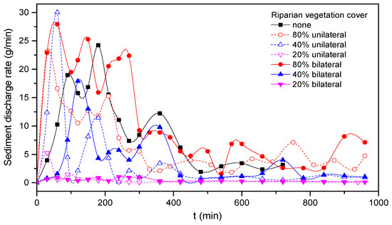 For the experimental scale of this small river channel, the maximum allowable dry fine sand passing with the flow was about 1.5 g/min for recovering the bedload sediment deficit, whereas the suspended load was derived from bank erosion as the channel progressed [32]. For the seven groups of experiments, the final relatively stable sediment transport rates are shown in Table 5. For 20% and 40% vegetation coverage rates under unilateral and bilateral riverbank vegetation coverage, the average sediment transport rates were significantly lower than without vegetation cover. When the flow passed through the vegetation zone, the existence of riparian plants increased the local hydraulic roughness, decreased the flow velocity and increased the sedimentation, and the vegetation zone effectively inhibited the lateral scour of the river channel. However, for the 80% vegetation coverage rate, the sediment transport rate increased.