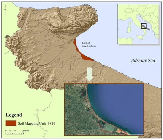 Reference area, identified by the soil mapping unit N° 9819 of the Harmonized World Soil Database [32].