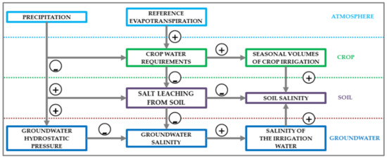 Cause–effect relationships among the factors related to weather, crop, soil, and groundwater, affecting soil salinity. Precipitation always favours a decrease in soil salinity by reducing the irrigation supply, promoting soil salt leaching, and avoiding the seawater intrusion into groundwater. The plus and minus signs identify positive and negative correlations, respectively. The final effect of one certain factor on soil salinity is obtained by multiplying the signs along the path.