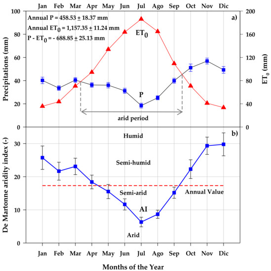 Climatic characterization of the reference area. Monthly averages of long-term climatic data (1975–2017) are reported. (a) Reference evapotranspiration (ET0) and precipitation (P); (b) De Martonne aridity index (AI).