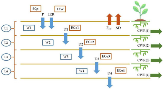 For I = 1 (i.e., considering the upper soil layer), we have to remind that WIN × CIN = IRR × CIR + P × CP. Where CIR and CP are the salt concentrations of irrigation and rain water, respectively. Therefore, Equation (8) can be modified accordingly: