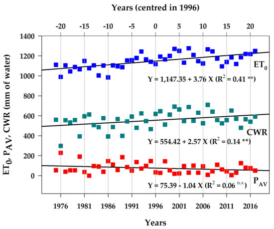 With respect to the 43-year period of climatic analysis, the time trend of both reference evapotranspiration (ET0) and crop water requirements (CRW) was shown to be statistically significant (p < 0.01) and an annual increase rate of 3.76 and 2.57 mm y−1, respectively, was detected (Figure 5).