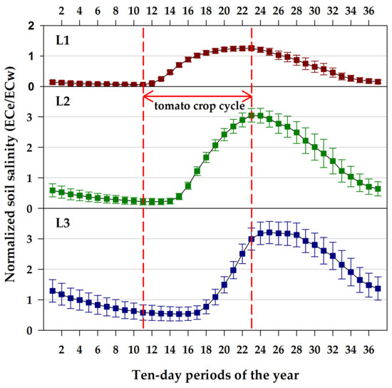 In general, the soil salinity dynamics closely reflect the considerable addition of salts by irrigation during the tomato-growing season (Figure 6). Salinity starts to increase on the eleventh ten-day period of the year (TDP), and reaches the maximum value on the twenty-third TDP, at the time of tomato transplanting and harvesting, respectively. A two-TDY lag-time is observed in the salinity build-up, proceeding from one soil layer to the lower one; irrigation water gradually moves the salts downwards, and very soon, the amount of salts in the deeper soil layers becomes much higher than that in the upper one. While the first soil layer is strongly leached by irrigation water, transferring the salts downwards, the second and the third soil layers are not, and their salinity level sharply increases (Figure 6).