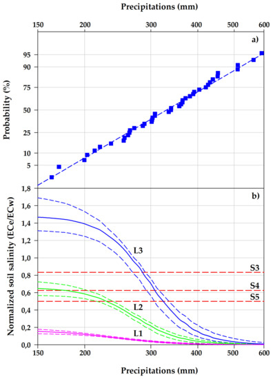 The fallow period is the fraction of time the soil is left bare, without any kind of cultivation. In our case study, this period lasts from tomato harvesting (day 230 of year Y) to tomato transplanting in the following year (day 110 of year Y + 1). The average total precipitation detected in this period was equal to 350.55 mm (std dev = 116.87 mm) and the probability distribution of this statistic is represented very well by a “log-normal” density function (Figure 7a). In response to a largely variable annual precipitation height, soil salinity at the start of the tomato growing season (DY 110) is greatly uneven, although quite predictable according to a probabilistic analysis shown in Figure 7. Like in Figure 6, soil salinity is expressed in normalized units; this data conversion allowed for representing a single curve for all possible salinity levels of irrigation water (Figure 7b). This means that the salinity level of irrigation water (S3, S4, and S5) largely affected the maximum salt content of soil layers in the absence of leaching, while salt leaching was totally controlled by rainfalls occurring in the fallow period, according to the observed climatic variability. No kind of interaction occurred between the two factors (i.e., water salinity and rainfall amounts). Conversely, different distribution curves represent the three consecutive soil layers (L1, L2, and L3); soil salinity at the start of the tomato-growing season and without leaching by rainfalls is much lower in L1 and is increasingly higher in L2 and L3. The distribution function is markedly a sigmoid curve, well described by a three-parameter “logistic” equation (M: maximum value, R: decreasing rate, and F: inflection point). Apart from the value of M, the other function parameters (R and F, respectively) have the same statistical values for all the soil layers (L1, L2, and L3), thus offering to consider exactly the same shape and dynamic behavior with respect to rainfalls. For each soil layer, a double-curve is shown in Figure 7b, representing 95% of all possible model outcomes included in it. From Figure 7, it is possible to detect that as the amount of rainfall increases, the initial level of soil salinity also decreases. Moreover, the estimated values at the three soil depths gradually approach one another, until they merge. Again, similar to Figure 6, it is worth noting that the double-curve is much larger in L3 and much smaller in L1; indeed, estimates related to deeper soil layers are much more uncertain and variable than estimates concerning upper soil layers.