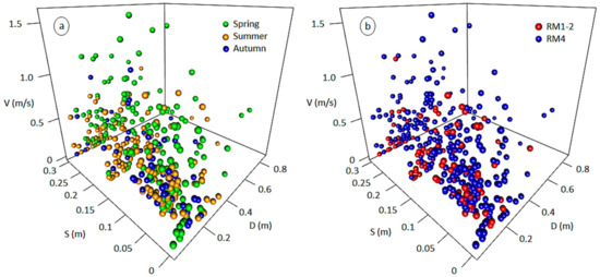 Three-dimensional representation of the 380 microhabitat samples of the benthos-GR dataset spanning three seasons (a) and two river types (b). V: flow velocity, D: water depth, S: substrate type.