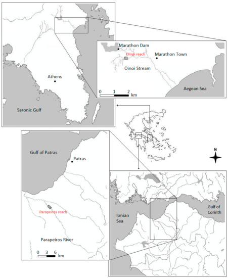 The Parapeiros River and Oinoi Stream where the relevant reaches were hydrodynamically simulated.