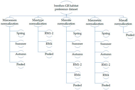 Typically, habitat preference datasets consist of microhabitat samples relating the flow velocity (V), the water depth (D) and the type of substrate (S) with a habitat suitability value, calculated either by using the abundance of target aquatic organisms or by applying traits- or metrics-based approaches. These preferences are often visualized in the two-dimensional space as habitat suitability curves [4,16,17] but other approaches have been also implemented [18,19,20]. The habitat preference datasets are then used as training data in hydraulic habitat models, that is, the reference data which will be used by the model to predict the habitat suitability (Κ) in samples/microhabitats with known V, D, and S values and unknown Κ. Currently, there are various alternatives available for the development of habitat suitability criteria, reflecting the aforementioned challenging effort to balance the sources of error and variation towards cost-effectiveness and time-efficiency. In this effort, hydroecological data from geographically and hydrologically various river types and in different time periods, often collected within different projects, are either treated separately to develop site- and season-specific criteria or are aggregated to increase sample size and/or extend the geographical and typological applicability of a model [21,22,23]. In BMI-based studies, typical aggregation schemes include spatiotemporal pooling-of samples from different sites and/or seasons-without pre-treatment [17,24]; spatial aggregation of samples only from specific, usually low-flow periods [25,26]; and spatiotemporal pooling of samples after proper pre-treatment [4,19,27].