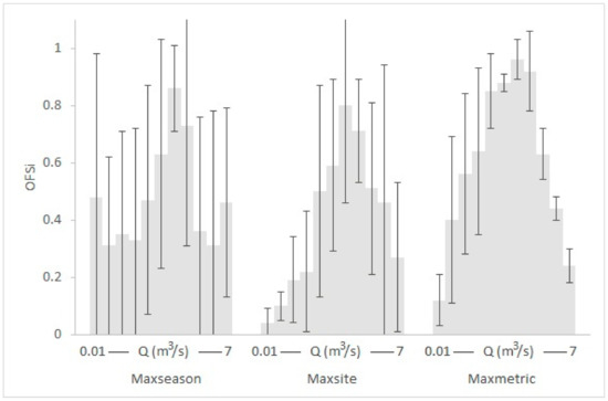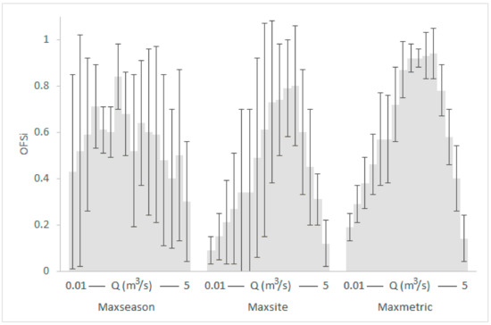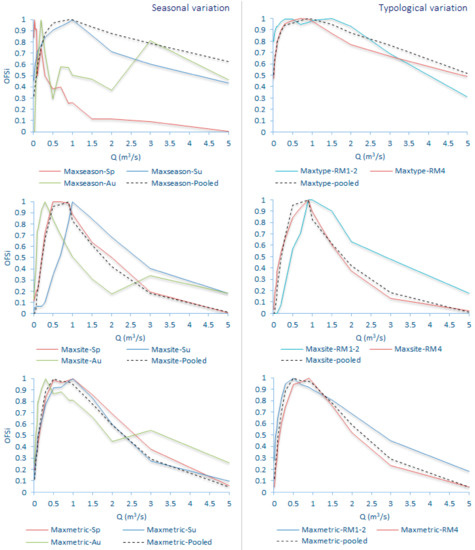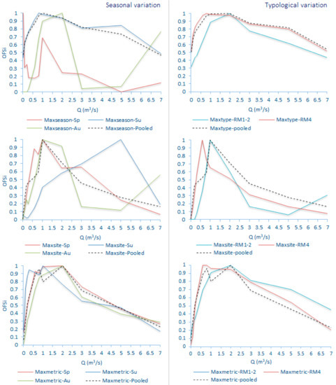 - The seasonal differences in the OFS values for the same Q within the various subsets were greater and more variable than the relevant typological differences. For example, in the Parapeiros reach, the OFS value for Q = 0.3 m3/s was 0.18 in spring, 0.77, in summer and 0.04 in autumn (mean: 0.33; SD: 0.39; maxseason normalization). For the same Q, the OFS value for the RM1-2 type was 0.46 and for the RM4 type was 0.86 (mean: 0.66; SD: 0.29; maxtype normalization). In the Oinoi reach, the OFS value for Q = 0.05 m3/s was 0.91 in spring, 0.61 in summer, and 0.26 in autumn (mean: 0.59; SD: 0.33; maxseason). For the RM1-2 type, the OFS for Q = 0.05 m3/s was 0.89, and for the RM4 type it was 0.65 (mean: 0.77; SD: 0.17; maxtype).