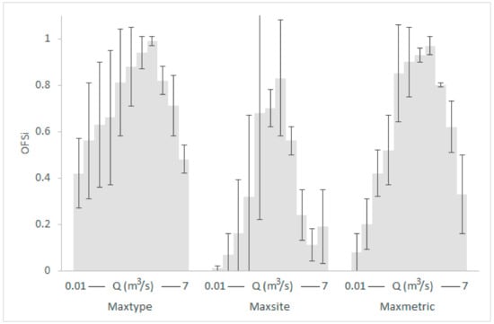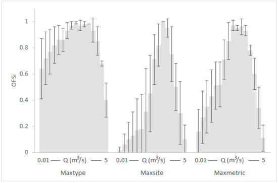 Graphical representation of the typological OFS means (gray shaded) and standard deviations within the various κ-normalization alternatives for the Parapeiros reach. The OFS values of RM1-2 and RM4 types for each discharge (Q) have been averaged.