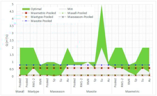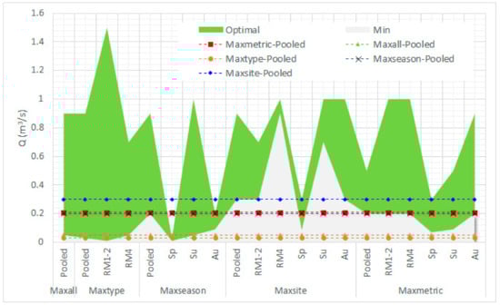 All values were normalized in a 0–1 scale by dividing each with the maximum OFS observed. Based on the status classification system introduced in the Water Framework Directive 2000/60/EC [47], all Q scenarios with OFS values higher than 0.6 were considered acceptable as environmental flows; Seasonal and typological comparisons were applied based on the minimum and optimal environmental flow predictions to ultimately explore the variation of the different environmental flow scenarios developed by the various subsets, corresponding to spatially and temporally different habitat suitability criteria.