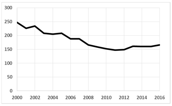 Residential water use in Melbourne, 2000–2016. X-axis: years. Y-axis: Per-capita residential water use in liters per person per day. Sourced from Melbourne Water [74].