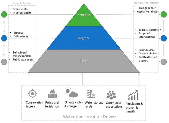 Here we draw on previous experiences to discuss the potential to improve water conservation practices into the future, with a focus on personalized messages to specific sectors and customer cohorts, smart metering, and nudging; plus, what this means in terms of research needs. Figure 2 depicts the types of actions that might be applied for interventions on a spectrum from broad-based approaches that seek to shape water demand for all customers, to more targeted approaches at specific sectors or cohorts that have been identified as receptive to water conservation, and finally, actions at the level of an individual customer. In reality, there will be cross-over and interdependencies between these levels of water conversation interventions. For example, smart meters across a sample of customers can be used to inform interventions targeted at specific cohorts, and also then inform likely responses to broad-level interventions, such as behavioral nudges where customers’ water consumption relative to a benchmark is displayed prominently on a bill to create a decision trigger for changed behavior or adoption of more water-efficient appliance. Water utilities designing conservation programs face a tension between individualizing programs to specific customer types versus broad-level programs that build awareness and create triggers for the adoption of water conservation across all customers. While individualized water conservation programs may provide the most appropriate interventions for specific customers they also come at increased cost and effort if programs are to be scaled up for broader adoption. For this reason, a hybrid approach may be most suitable based on the Pareto principle that develops individualized water conservation interventions for the 20% of customers who can potentially provide 80% of the water savings, while remaining customers are targeted through broad approaches.