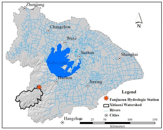 Monthly mean temperature and precipitation data of 13 meteorological stations from 1979 to 2011, which were distributed in and around the total basin, were acquired in this study. The station data had to be interpolated into grids with a 250 × 250 m grid size by the inverse distance-weighted interpolation (IDW) method, and 120 precipitation and temperature raster maps from 2002 to 2011 were acquired. Due to the flat terrains and complex river network, most of the river system is not independent, and it exchanges water with Taihu Lake and other river systems in the TLB by man-made water courses. Most of the gauge stations are affected by the return flow of Taihu Lake and hydrologic engineering facilities. In this study, the Xitiaoxi Watershed, with its independent natural river system, which lies in the southwest of Taihu Lake Basin and is the largest watershed in the up-river area of Taihu Lake, was selected for model calibration and verification. The monthly flow discharge data of the Fanjiachun gauge station, located downstream of the Xitiaoxi river system, were obtained from Huzhou Bureaus of Water Resource.