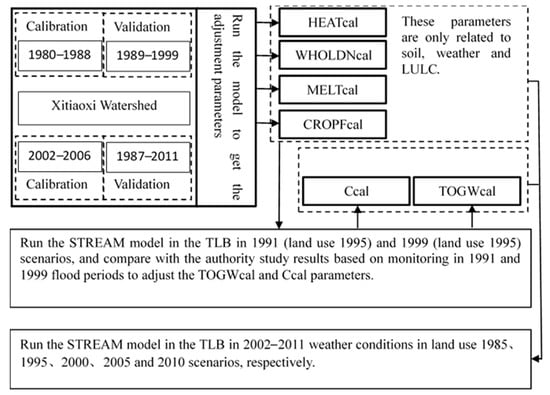 The STREAM model was calibrated and validated on the basis of observation data over the stages 1980–1999 and 2002–2011 in Xitiaoxi watershed (Figure 3). The calibrated parameters included CROPFcal, HEATcal, WHOLDNcal, Ccal and TOGWcal (Table 1). The initial parameters were adjusted automatically to reflect more realistic values using the monthly input data. The flow discharge dataset was split into two time slices in each phase. The first phase was divided into two periods: 1980–1988 and 1989–1999, and the second phase was divided into two periods, 2002–2006 and 2007–2010. The first period was used to calibrate the model, and the second period was used to validate the model. These parameters were then used to simulate the flow discharge of the entire TLB in 1991 (land use 1995) and 1999 (land use 2000), and the parameters of Ccal and TOGWcal were further adjusted by comparing the flow discharge of the TLB with the measured value in the flood periods of 1991 and 1999.