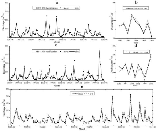 Calibration and verification: (a) calibration period of 1980–1988; (b) flow discharge and measured values of 1980–1989; (c) verification period of 1980–1988; (d) flow discharge and measured values of 1989–1999; (e) calibration and verification period of 2002–2011).