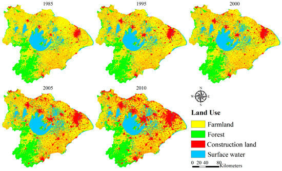 During the study period, LULC changes in TLB are shown in Table 2, which were mainly manifested as the continuous decrease of farmland area, and the continuous increase of construction land area. In 1985, construction land area only accounted for 9.68% in the TLB, and by 2010, the proportion has increased to 24.24%; meanwhile, the proportion of farmland area dropped from 63.65% to 47.90%. The increase in construction land area was mainly due to the rapid expansion of cities and towns, which occupied the surrounding farmland (Figure 5). Among them, the expansion of construction land area was divided into two stages: during 1985–2000, the expansion of construction land was relatively smoothly, only increasing by 3.73% in 15 years. During 2000–2010, the river basin entered a rapid development period, and the construction land area increased by 10.83%. From the perspective of spatial distribution, the areas with the most dramatic increase in construction land area were mainly located in the northern part of the basin. This was mainly due to the rapid development of Shanghai, Suzhou, Wuxi, and Changzhou in the northern part of the river basin.