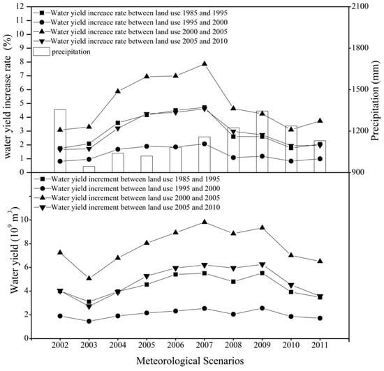 Climate input was an important factor that affected the water yield in the TLB. In order to eliminate the possible impact of precipitation and air temperature difference, water yields were simulated by 2002–2011 climate scenarios and LULC changes, and their mean value was used to evaluate the effects of LULC changes on the water yields. As shown in Figure 6, from 1985 to 1995, the annual water yield increased by an average of 2.99%, about 442 million cubic meters, with a maximum growth rate of 4.71% and about 550 million cubic meters; the correlation coefficient between precipitation and water yield increment was 0.35. In 1995–2000, the annual water yield increased by an average of 1.34%, about 205 million cubic meters, with a maximum growth rate of 2.07 percent, about 254 million cubic meters; and the correlation coefficient was 0.38 between the precipitation and the water yield increment. In 2000–2005, the annual water yield increased by 4.97% on average, about 776 million cubic meters, with a maximum growth rate of 7.86%, about 981 million cubic meters, and the correlation coefficient between precipitation and water yield increment was 0.43. From 2005 to 2010, the annual water yield increased by an average of 2.94%, about 484 million cubic meters, with a maximum growth rate of 4.61%, about 621 million cubic meters, and the correlation coefficient was 0.39 between the precipitation and the water yield growth. According to the change characteristics of the annual water yield from 1985 to 2010, the annual increase of water yield was much higher in 2000–2010 than in 1985–2000, when land use change was more severe. Obviously, the LULC change was an important reason for the increase of runoff. On the other hand, there was no strong linear correlation between runoff increment and precipitation, which may be related to the spatial distribution difference of climate input.