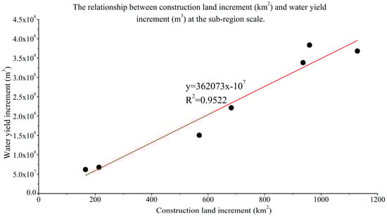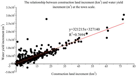 The regression analysis was also used to analyze the growth of water yield and the increment of construction land from 1985 to 2010 at the town scale. As shown in Figure 11, there was a good linear relationship between the growth of water yield and the increment of construction land. The gradient was 321,215, which was about 11.28% lower than the sub-region scale. This not only showed that the increase of construction land area has a significant impact on the regional runoff in the rapid urbanization area, which is consistent with some existing research results [,], but also that every increase of 1 km2 of construction land in the TLB will lead to an increase of water yield by more than 300,000 m3.