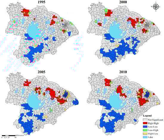 Water yields (mm) of towns in the TLB after 1995 were carried out by empirical Bayesian standardization based on water yields in 1985, and MIs were calculated. The results showed that the global MIs were above 0 in all stages, and they rose from 0.22 to 0.38 (Figure 9), which indicated that the spatial aggregation of the water yield increase rate in TLB was gradually strengthened. The results of the LISA analysis (Figure 10) showed that there was a significant spatial difference in the growth rate of the water yield in the TLB. High growth centers were mainly located in the north of the basin, while the low growth centers were mainly located in the southwest of the basin. In the northern part of the basin where cities were developing more rapidly, the high-high centers had significant expansion trends. The water yields growth rate of the towns in the southwest was generally at a low level.