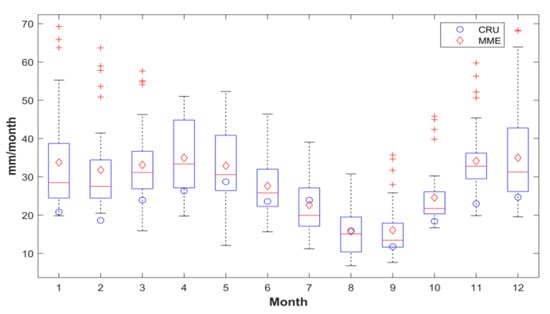 Figure 3 shows the box-and-whisker plot of the monthly average precipitation in CA from 1986 to 2005. The red diamond represents the mean values of MME, and the blue circle represents the mean values of observation. The blue box represents the maximum, upper quartile, median, lower quartile, and minimum of the precipitation simulated by MME.