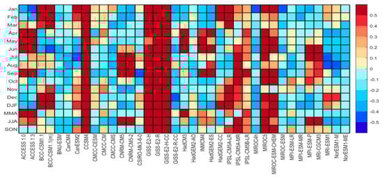 RRMSE provides a metric to measure a model’s performance between the simulations and observation. When the RRMSE is less than 10%, the simulation effect of the model is considered excellent. If the RRMSE is between 10% and 20%, it is considered good. If the RRMSE is between 20% and 30%, the model is acceptable. If RRMSE is greater than 30%, the simulation effect of the model is considered poor [48]. It can be seen from Table 2, the RRMSE value ranged from −16.81% to 70.30%. There are 29 models with the RRMSE value less than 10%, which is the excellent level. The model with the smallest value of RRMSE is MIROC5. There are four models that did not reach the desired level. They are GISS-E2-H, GISS-E2-R, GISS-E2-H-CC, GISS-E2-R-CC.