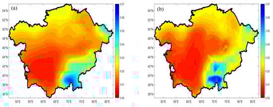 Figure 2c shows the RMSE of annual mean precipitation in 1986–2005 from the CMIP5 MME and CRU. As can be seen from Figure 2c, the RMSE of Uzbekistan and Turkmenistan is less than 0.02 mm/day, which shows that the CMIP5 MME can simulate the annual average precipitation in this area well. The RMSE of the eastern part of Kazakhstan is also below 0.02 mm/day. The RMSE of the northwestern part of Kazakhstan is about 0.06 mm/day, indicating that the climate model has slightly overestimated precipitation in this region. In Tajikistan and eastern Kyrgyzstan, the RMSE is about 0.1 mm/day. Especially in the Pamir area, the RMSE reaches the maximum of 0.17 mm/day, indicating that the CMIP5 MME also overestimated precipitation in this region. However, the RMSE in most of CA is below 0.04, indicating that CMIP5 MME can better simulate the historical precipitation characteristics of CA in 1986–2005. In order to assess the simulation capacity of CMIP5 MME on the interannual variability of precipitation, we calculated the difference of the standard deviation between CMIP5 MME and observation (MME minus CRU). As shown in Figure 2d, the high value center of precipitation interannual variability appears in eastern Kyrgyzstan and eastern Tajikistan. In contrast to Figure 2c, the interannual precipitation variation of the high value center and the RMSE of the high value area are basically consistent. In areas with a large precipitation, the interannual variability of precipitation is large.