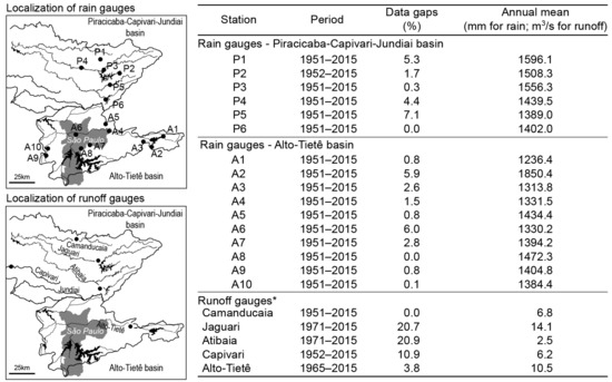 Daily precipitation and runoff data available on the Alto-Tietê basin and the headwaters of the PCJ catchment were provided by the Departamento de Águas e Energia Elétrica (DAEE) of São Paulo State and the National Water Agency (Agência Nacional de Águas, ANA), for the period 1930–2017. Gauging stations that had records during the 2013–2015 period, and less than 10% gaps for precipitation, were selected, reducing the analysis to the 1951–2015 period. In the Alto-Tietê basin, 10 precipitation stations and one runoff station monitoring the Alto-Tietê River were used while in the headwaters of the PCJ basin, 6 precipitation stations and 4 runoff stations monitoring the Camanducaia, Jaguari, Atibaia and Capivari rivers were considered (Figure 1 and Figure 2). For the Jaguari and Atibaia rivers, the gauging stations are respectively located at the outlet of the two first reservoirs (Jaguari and Jacareí) and the fourth reservoir (Atibainha) of the Cantareira System (Figure 2). Based on this data, daily, monthly and annual analyses were carried out but, for synthesis purposes, results will be presented at a decadal or seasonal time-step.