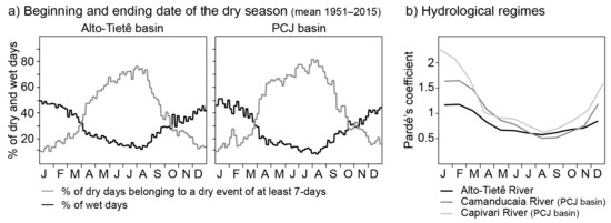 The analysis of the beginning and ending of the dry season shows that the Alto-Tietê basin and the headwater of the PCJ basin are characterized by a dry season extending from April to mid-October (Figure 3a). During the dry season, more than 30% of dry days belong to a dry event of at least seven days and there are less than 20% of wet days. The driest months are July and August during which 65–75% and 70–80% of dry days belong to a dry event of at least seven days in the Alto-Tietê basin and the headwater of the PCJ basin, respectively, and there are less than 20% and 10% of wet days, respectively. In both basins, the wet season extends from mid-October to March. The wettest months are December, January and February (Figure 3a). They are characterized by 40–50% of wet days and less than 10% of dry days belonging to a dry event lasting at least seven days.