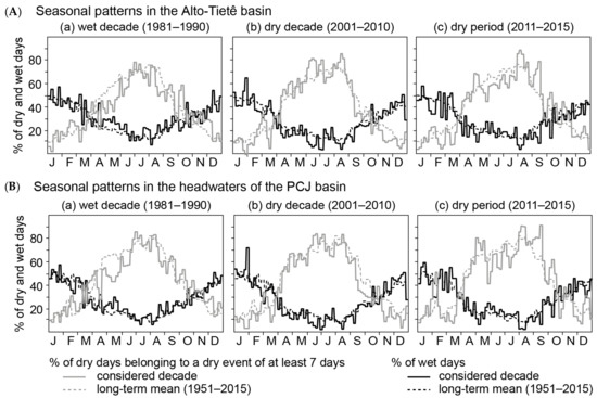 The dry nature of the decades 1971–1980, 2001–2010, and 2011–2015 could also be outlined. In the former cases, more dry days belonging to a dry event of at least seven days were recorded during the wet season compared to the 1951–2015 average (Figure 4A(b),B(b) illustrated by the decade 2001–2010). The curve of the percentage of dry days belonging to a dry event of at least seven days is even above the curve of the percentage of wet days at times, highlighting short dry periods prior the dry season. For the latter case, the dry season was identified as more intense than the long-term average with (i) a dry season ending in mid-November in the Alto-Tiete (Figure 4A(c)), (ii) 70–80% and 80–90% of dry days belonging to a dry event of at least seven days in August, in the Alto-Tiete basin (Figure 4A(c)) and the headwater of the PCJ basin (Figure 4B(c)), respectively, (iii) 40% of dry days still belonging to a dry event of at least seven days in October and November in both basins, and (iv) less than 10% of wet days in August and less than 20% in September and October in both basins.